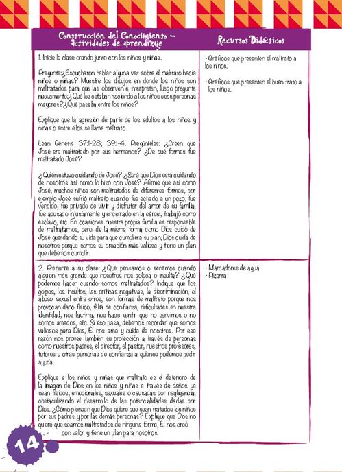 El propósito de este recurso es entender que Jesús pone personas que cuidan nuestras vidas. Este documento esta compuesto de cuatro lecciones sobre los temas: Dios no quiere que yo sea maltratado, Reconozco a gente peligrosa en mi entorno y debo evitarla, Soy creación de Dios y nadie me toca sin mi permiso, Puedo prevenir situaciones de abuso. Incluye objetivos claros e instrucciones guiadas para el maestro, incluyendo la preparación y actividades sugeridas para facilitar el aprendizaje de una manera divertida e interactiva. Este recurso está diseñado para niños entre 7-8 años y es la primera unidad del manual “Dios Hace un Pacto Para Mi Vida,” lo cual es parte de la serie "Plan de Estudios de Desarrollo del Niño," un programa de desarrollo integral para niños y niñas, dirigido específicamente a los educadores que trabajan con niños y niñas en sus comunidades.