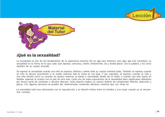 El propósito de este manual es contribuir a que los niños entre los 6 a 7 años cambien sus hábitos personales de salud, a través de diferentes actividades planteadas en el currículo, para prevenir diferentes enfermedades que se puedan presentar en sus cuerpos. Este documento esta compuesto de 6 unidades: Las relaciones sexuales, Los roles sociales, Caracteres sexuales secundarios, La nutrición, El carácter y Cuidemos nuestro entorno. Incluye objetivos claros e instrucciones guiadas para el maestro, incluyendo la preparación y actividades sugeridas para facilitar el aprendizaje de una manera divertida e interactiva. Este recurso está diseñado para niños entre 6-7 años y es parte de la serie "Conquistadores," lo cual es un programa de desarrollo integral para niños y niñas, dirigido específicamente a los educadores que trabajan con niños y niñas en sus comunidades.